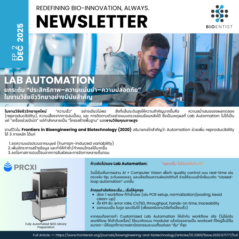 ในงานวิจัยชีววิทยายุคใหม่ “ความเร็ว” อย่างเดียวไม่พอ สิ่งที่แล็บระดับสูงให้ความสำคัญมากขึ้นคือ ความสม่ำเสมอของผลทดลอง (reproducibility), ความเสี่ยงจากการปนเปื้อน, และ การติดตามตัวอย่างแบบตรวจสอบย้อนหลังได้ ซึ่งเป็นเหตุผลที่ Lab Automation ไม่ได้เป็นแค่ “เครื่องช่วยปิเปต” แต่กำลังกลายเป็น “โครงสร้างพื้นฐาน” ของงานวิจัยคุณภาพสูง