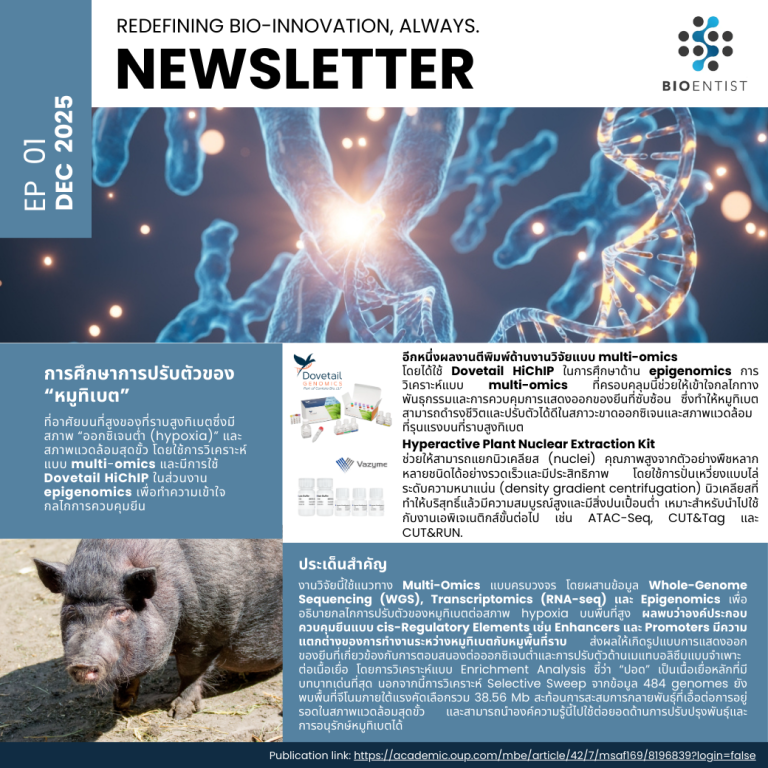 การศึกษาการปรับตัวของ “หมูทิเบต” ที่อาศัยบนที่สูงของที่ราบสูงทิเบตซึ่งมีสภาพ “ออกซิเจนต่ำ (hypoxia)” และสภาพแวดล้อมสุดขั้ว โดยใช้การวิเคราะห์แบบ multi-omics และมีการใช้ Dovetail HiChIP ในส่วนงาน epigenomics เพื่อทำความเข้าใจกลไกการควบคุมยีน